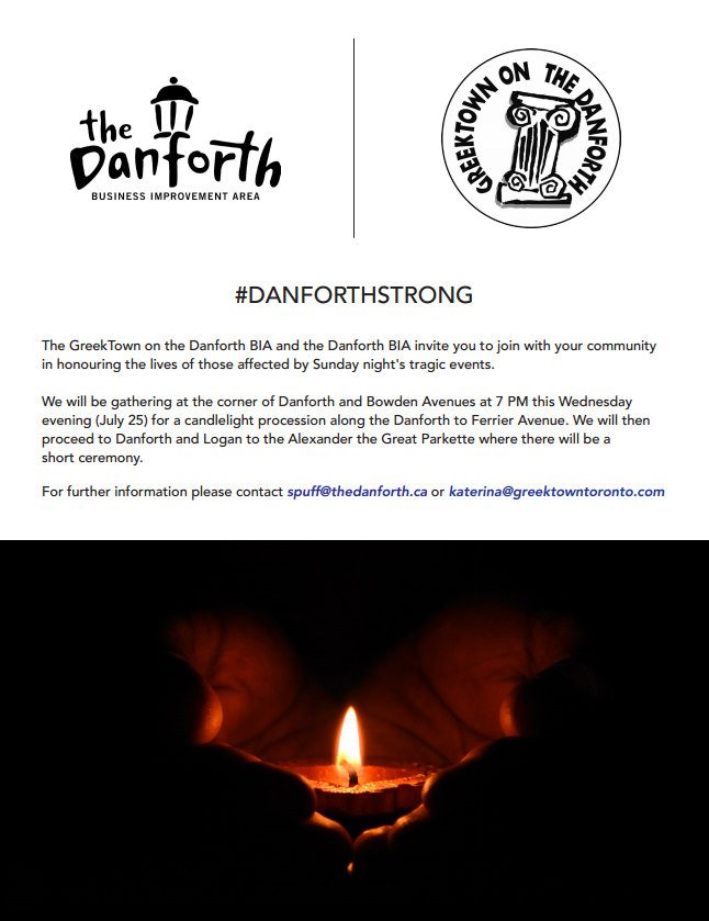 Last night we met with our 2 city councillors, Paula Fletcher and Mary Fragedakis, our MPP Peter Tabuns, Mayor Tory, representatives from Riverdale Share and our local churches, and our neighbour Greektown BIA. Together we are hosting a Danforth Strong vigil tomorrow evening (Weds. July 25) starting at 7pm. People will gather at the corner of Bowden and Danforth in our BIA (where the shooting finally stopped) and walk to Ferrier Avenue (where the shooting started) and then back to the Logan and Danforth parkette for a formal program. Attached is the flyer with all of the information. We hope that as many of you who wish to join will do so and please post the information on your social media and pass it on to any one else that you know who would be interested in attending this vigil.