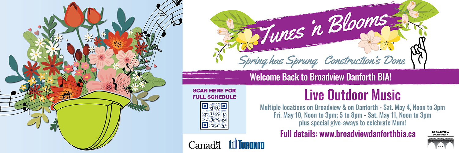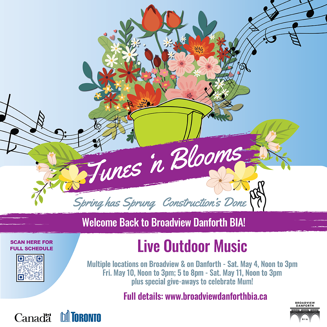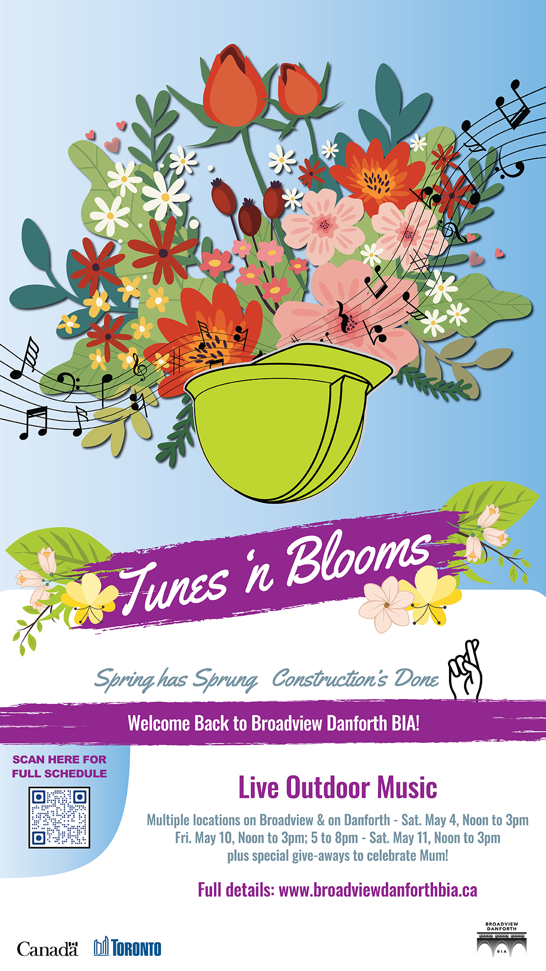 I want to share the details for our upcoming Tunes 'n Blooms street festival.  We will be hosting outdoor bands this coming Sat. May 4 and next Fri. May 10th and then on Saturday, May 11th we will be hosting a full BIA street festival including a sidewalk sale, bands, giveaways etc.  This is a great opportunity to promote your business and I hope that you will take advantage of it and participate.  If you can please make sure your neighbouring businesses read this email.  Below are the full details for the Sat. May 11th festival.