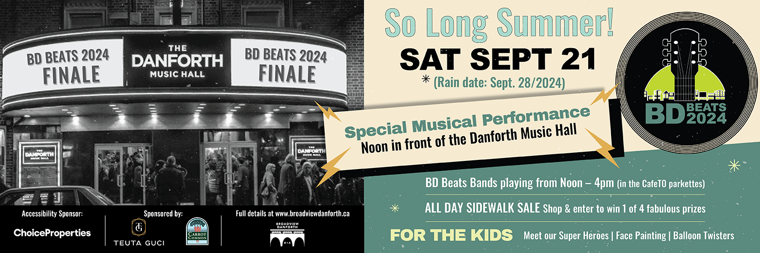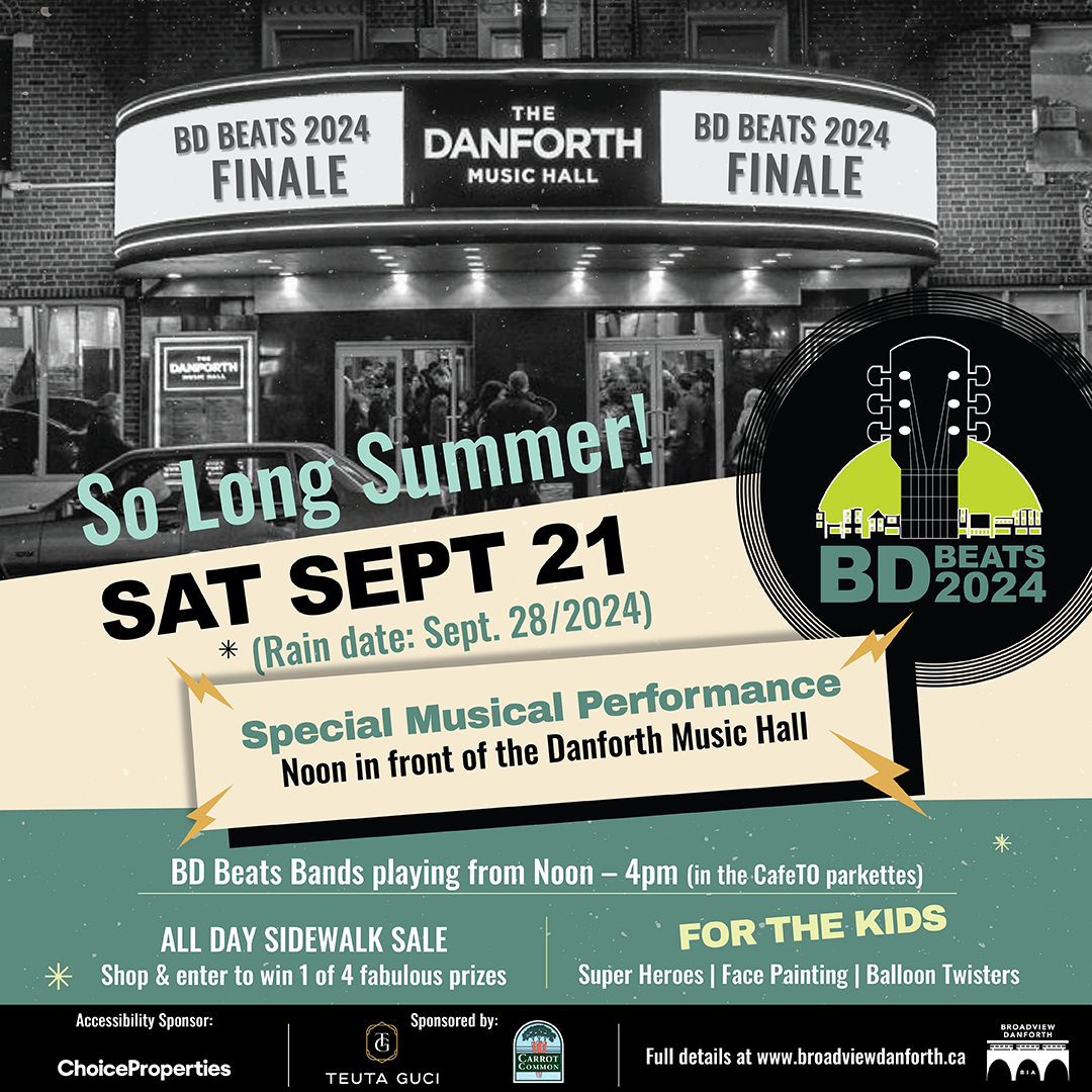 - At noon under the marquee of the Danforth Music Hall we will be presenting a special musical performance. Again from my Aug. 16th email - we have been gifted an original piece of music that was created in the 1950's for the then Danforth Businessmen's Association. At the time it was their theme song and played at their events. We have assembled some of our BD Beats musicians and they have been rehearsing the music and will be performing it at noon on the 21st! It would be wonderful if you're able to pop out of your business for a few minutes to join us at noon.