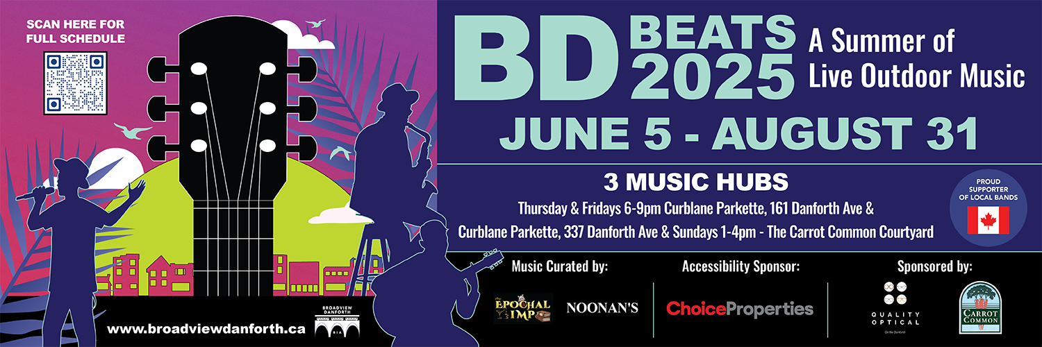 BD Beats will run from now through to Sunday, August 31 (Labour Day weekend) with bands playing every Thursday and Friday nights from 6pm to 9pm on the CafeTO patios located in front of Papyrus Restaurant between Bowden and Hampton Aves, and on the SideBar Restaurant patio and Sunday afternoons from 1pm to 4pm in the Carrot Common courtyard.