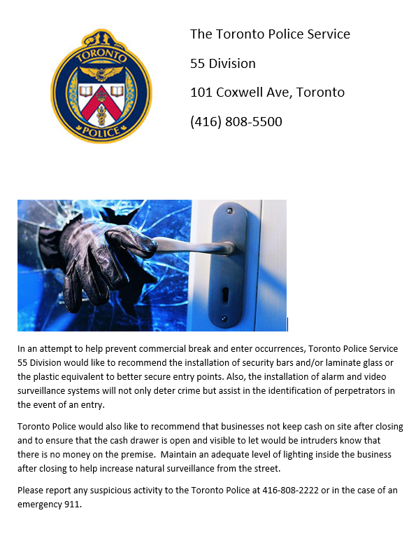 "As the province goes into its second state of emergency and complete lockdown, 55 Division has developed a crime prevention and enforcement plan to address Commercial Break and Enters in three major hot spots within the Division, Danforth Ave., Queen St. and Gerrard St. We will increase the number of patrols in the area and have uniform and plainclothes officers dedicated to these areas. As you may recall from the last State of Emergency back in April 2020, our Project was very successful with the arrest of several individuals. "