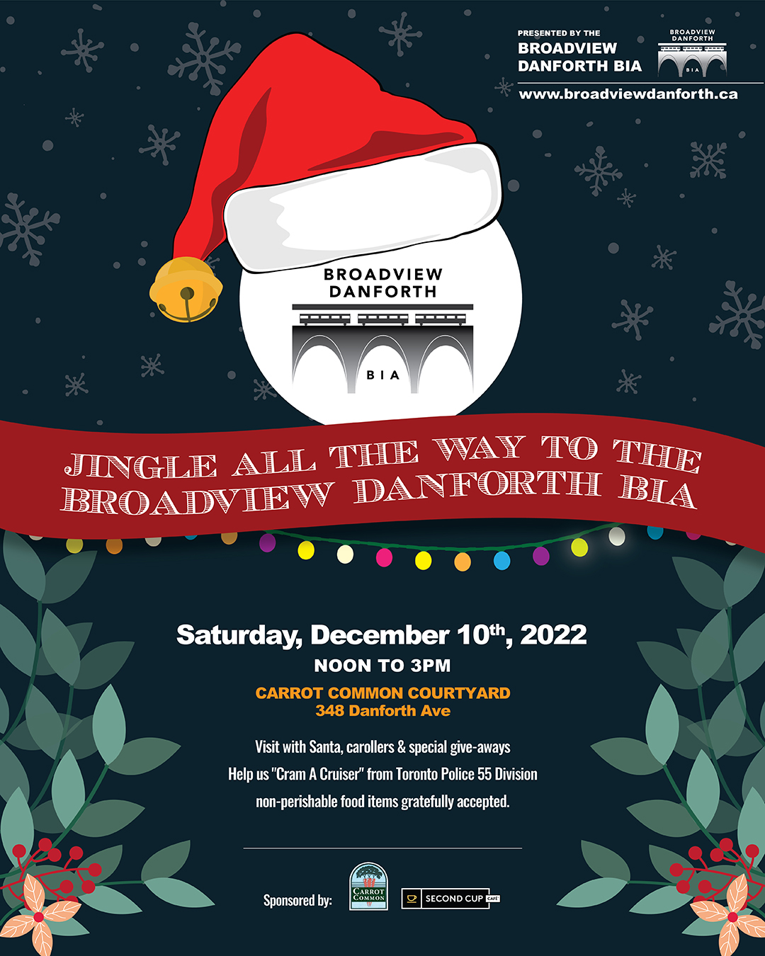 - We will have 3 sets of carollers from the Canadian Opera Company: one set will be strolling on Broadview from Pretoria to our Loblaws; one set will be strolling along our part of the Danforth from Broadview to Hampton; and the 3rd group will be located with Santa in the courtyard of the Carrot Common.  The carollers will all be performing from noon to 3pm.